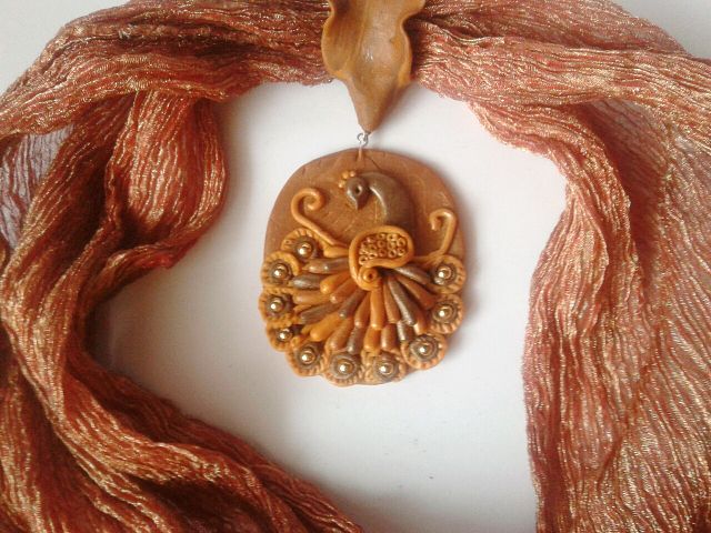 Вот результат эксперимента с шарфиком. Сделала подвеску, которая превращает обычный шарфик в стильное ожерелье.